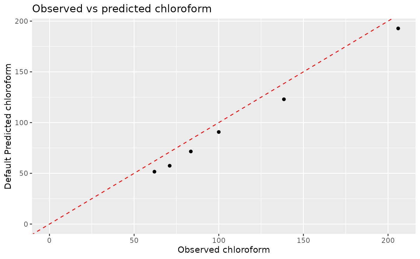 geom_point(data = plot_unfit_dbps, aes(x = fin_chcl3, y = disinfected_chcl3, color = "Default coeffs")) +